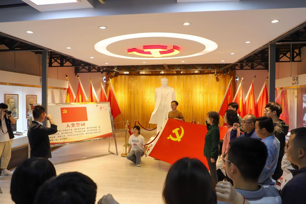 在南海红色收藏馆毛泽东纪念碑前,面对鲜红的党旗,全体党员整齐列队,神情庄重,公司党委书记张鑫作为领誓人,带领全体党员一起高举右手,进行入党宣誓,接受党性教育和精神洗礼。重温入党誓词使师生党员回顾入党时的思想激情和奋斗追求,再次提醒着自己所肩负的神圣使命和责任,牢记自己的身份,增强党性观念,积极为党工作。