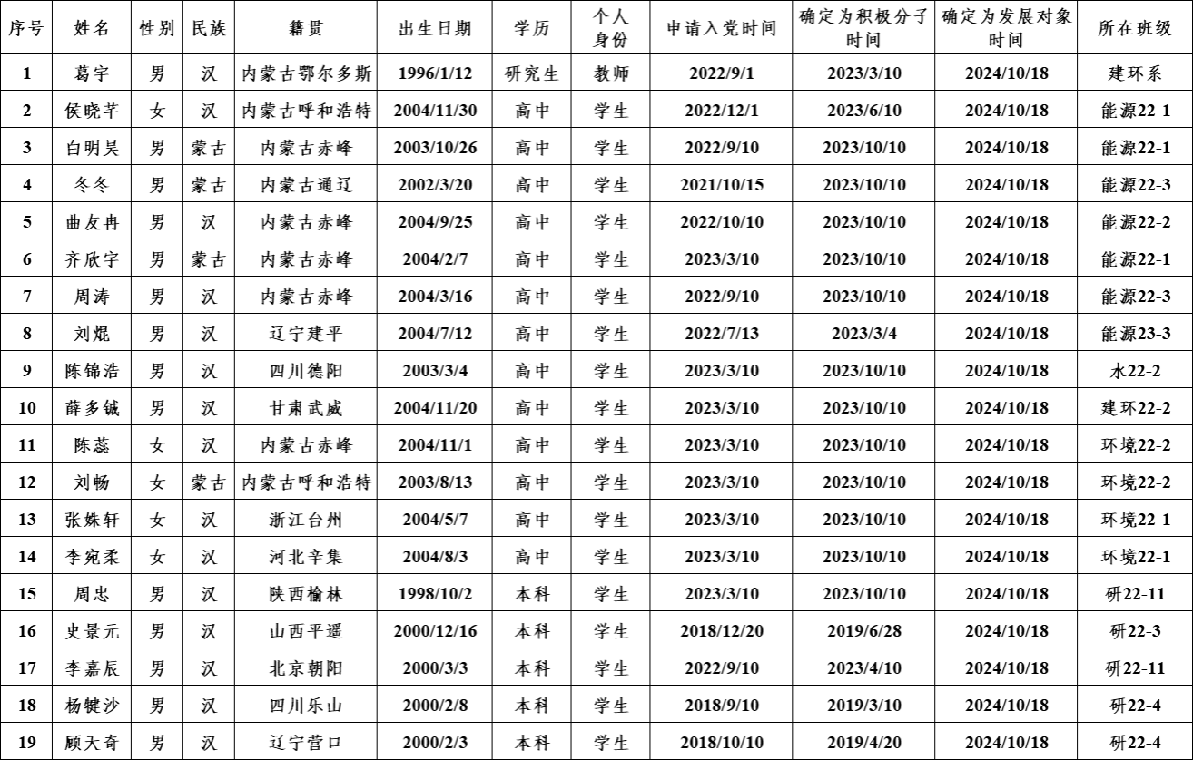 能源与环境公司党委于2024年10月18日召开党委会讨论决定,确定葛宇等19位同志为党员发展对象。为进一步增强发展党员工作的透明度,确保发展新党员的质量,根据《中国共产党章程》和《中国共产党发展党员工作细则》,现将葛宇等19位同志的基本情况予以公示: