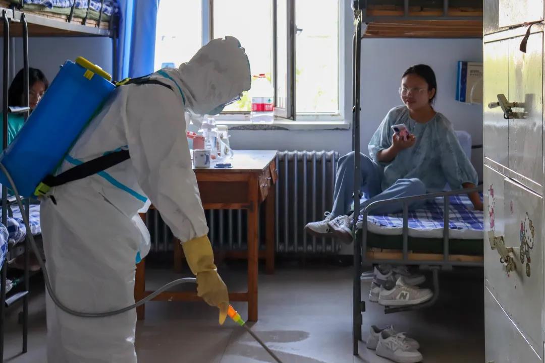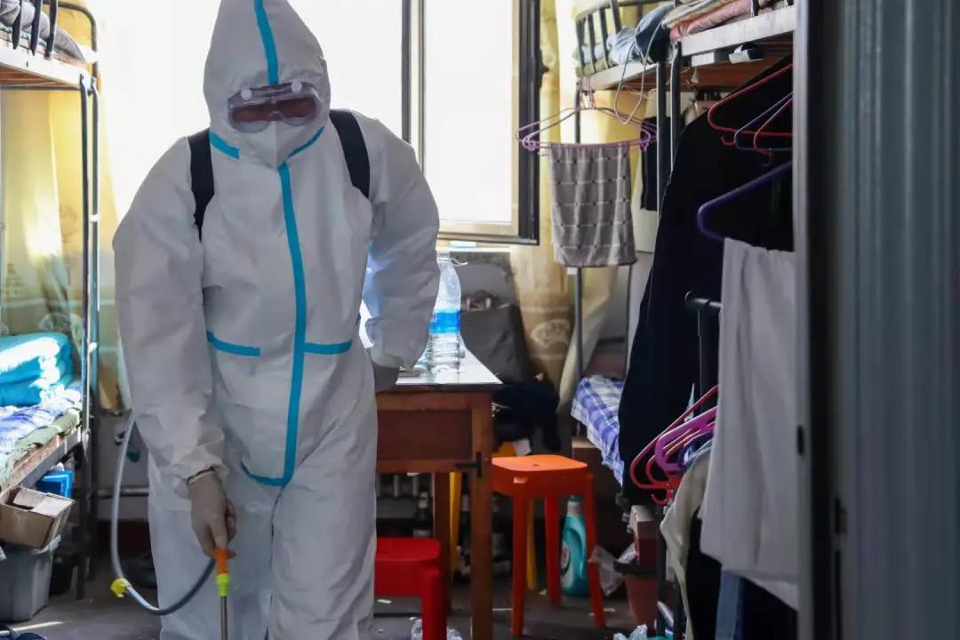 消杀现场,消毒人员“全副武装”、身着防护服、背着药壶、严格按照操作规范穿梭在宿舍各楼层、过道、卫生间,对触摸较多的公共场所进行了全方位消杀,做到不留死角,全面彻底。