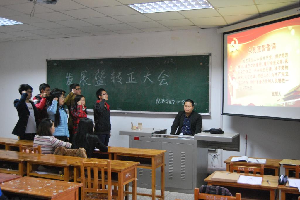 2015年11月25日下午4:30太阳集团122cc员工第四党支部"积极分子发展大会"在秋实楼b405召开,参加本次大会的有:员工第四党支部书记姜伟利、支部全体党员及本次发展的八位同志。