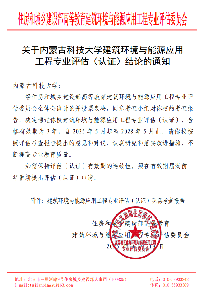 近日,住房和城乡建设部高等教育建筑环境与能源应用工程专业评估委员会发布了建筑环境与能源应用工程专业评估(认证)结论的通告,公司建筑环境与能源应用工程专业通过住房和城乡建设部高等教育专业评估(认证)。