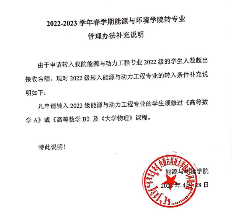 2022-2023学年春学期太阳集团122cc转专业管理办法补充说明