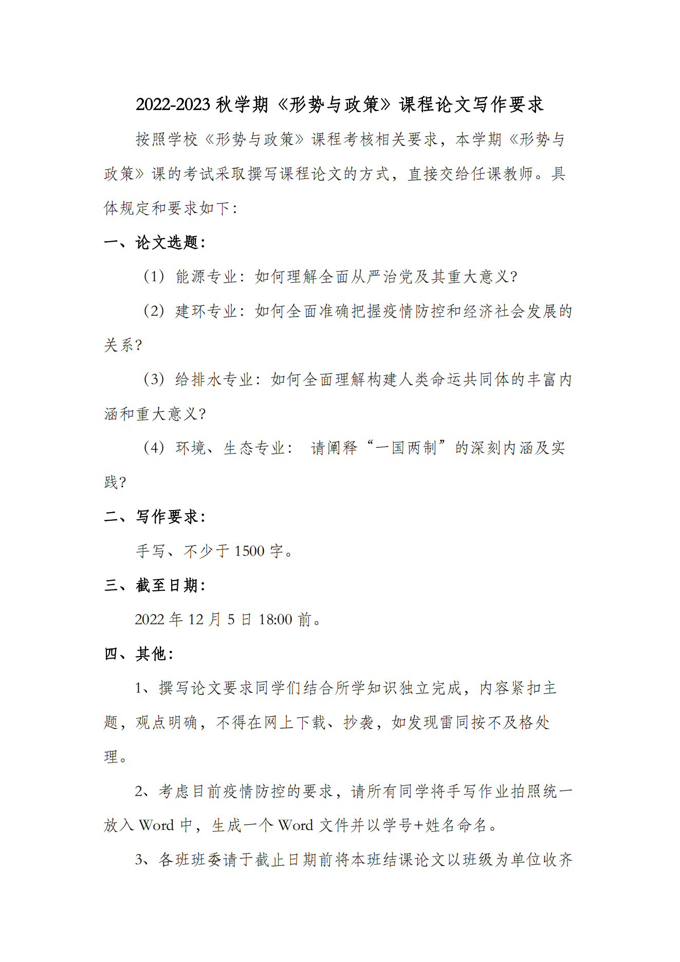 2022-2023 秋学期《形势与政策》课程论文写作要求