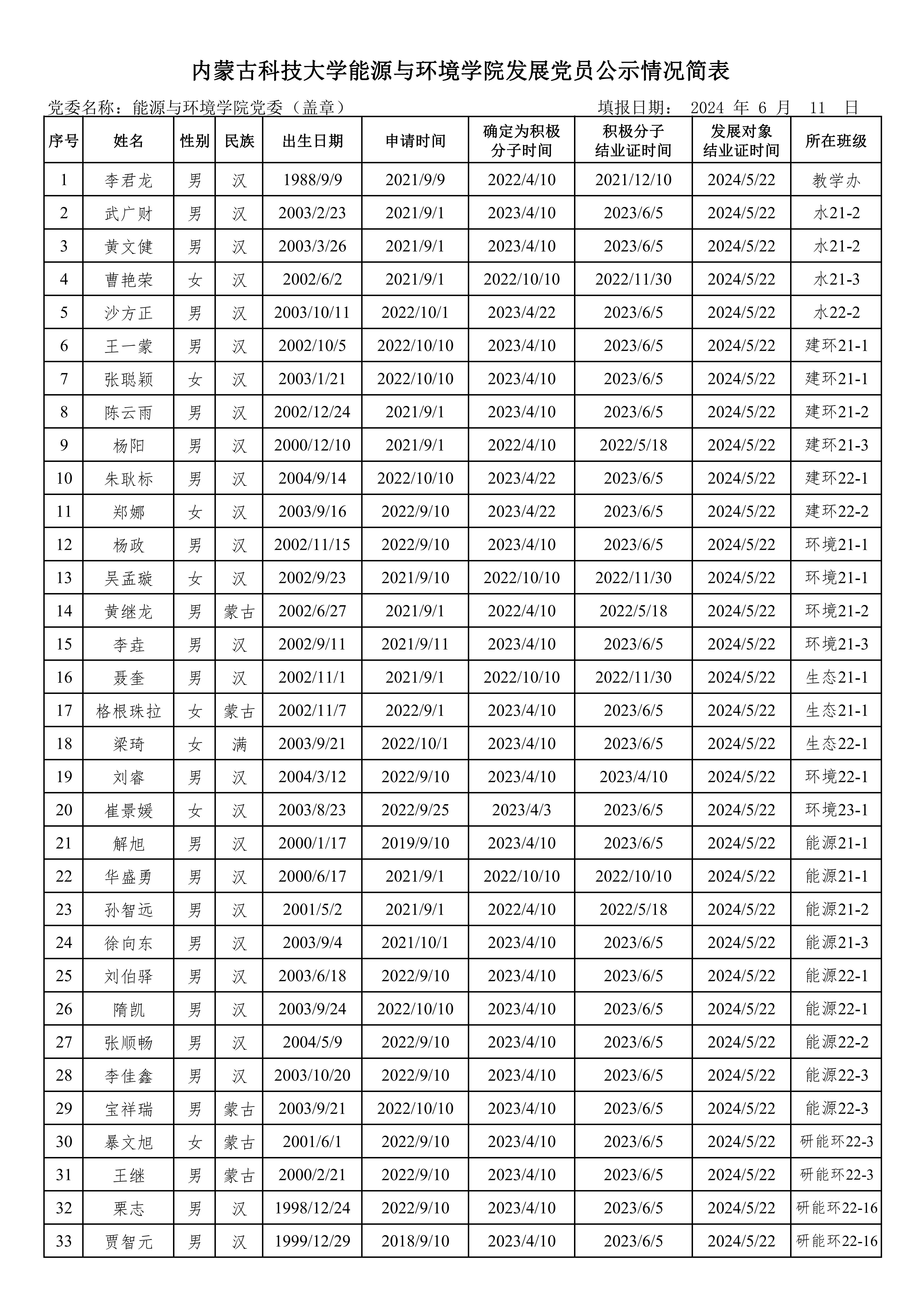 经过一年以上的培养教育和考察,李君龙、武广财、黄文健、曹艳荣、沙方正、王一蒙、张聪颖、陈云雨、杨阳、朱耿标、郑娜、杨政、吴孟璇、黄继龙、李垚、聂奎、格根珠拉、梁琦、刘睿、崔景媛、解旭、华盛勇、孙智远、徐向东、刘伯驿、隋凯、张顺畅、李佳鑫、宝祥瑞、暴文旭、王继、栗志和贾智元共三十三位同志拟接收为中共预备党员(详见附表)。为进一步增强发展党员工作的透明度,确保发展新党员的质量,根据《中国共产党章程》和《中国共产党发展党员工作细则》,现将发展对象的基本情况予以公示。