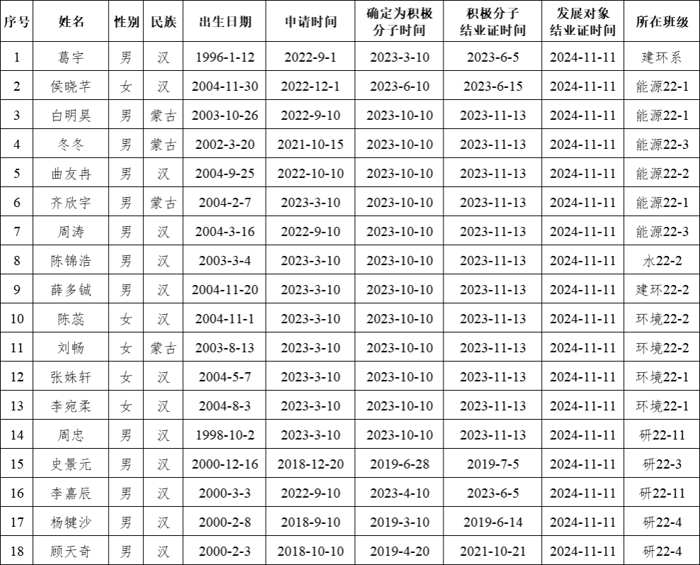 经过一年以上的培养教育和考察,葛宇、侯晓芊、白明昊、冬冬、曲友冉、齐欣宇、周涛、陈锦浩、薛多铖、陈蕊、刘畅、张姝轩、李宛柔、周忠、史景元、李嘉辰、杨犍沙和顾天奇共十八位同志拟接收为中共预备党员(详见附表)。为进一步增强发展党员工作的透明度,确保发展新党员的质量,根据《中国共产党章程》和《中国共产党发展党员工作细则》,现将发展对象的基本情况予以公示。